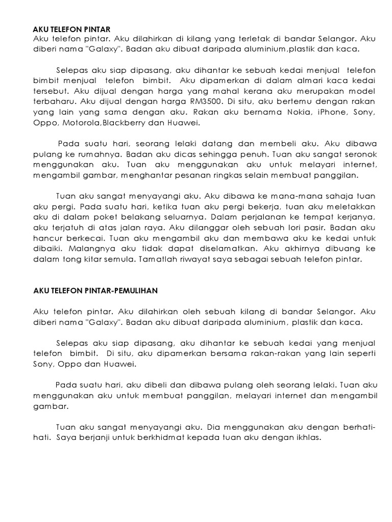 Pelajar boleh mengambil isi-isi penting sebagai idea bagi membuat penulisan karangan. Saya hanya mahu hidup seperti telefon pintar pada setiap masa. Kini telefon pintar dianggap sebagai satu trend gaya hidup para remaja tidak kira sama ada dari golongan atasan atau kelas pertengahan.